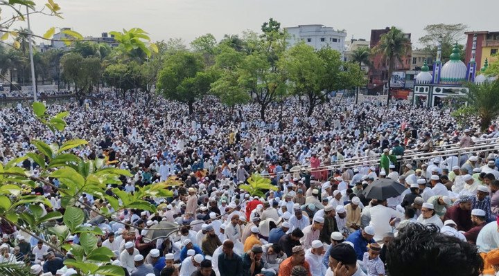 ধর্মপ্রাণ মুসল্লিরা পবিত্র রমজানে পুরো এক মাস রোজা পালন করেন। আজ শনিবার সকালে জামাতে মুসলমানরা ঈদের নামাজ আদায় করছেন।